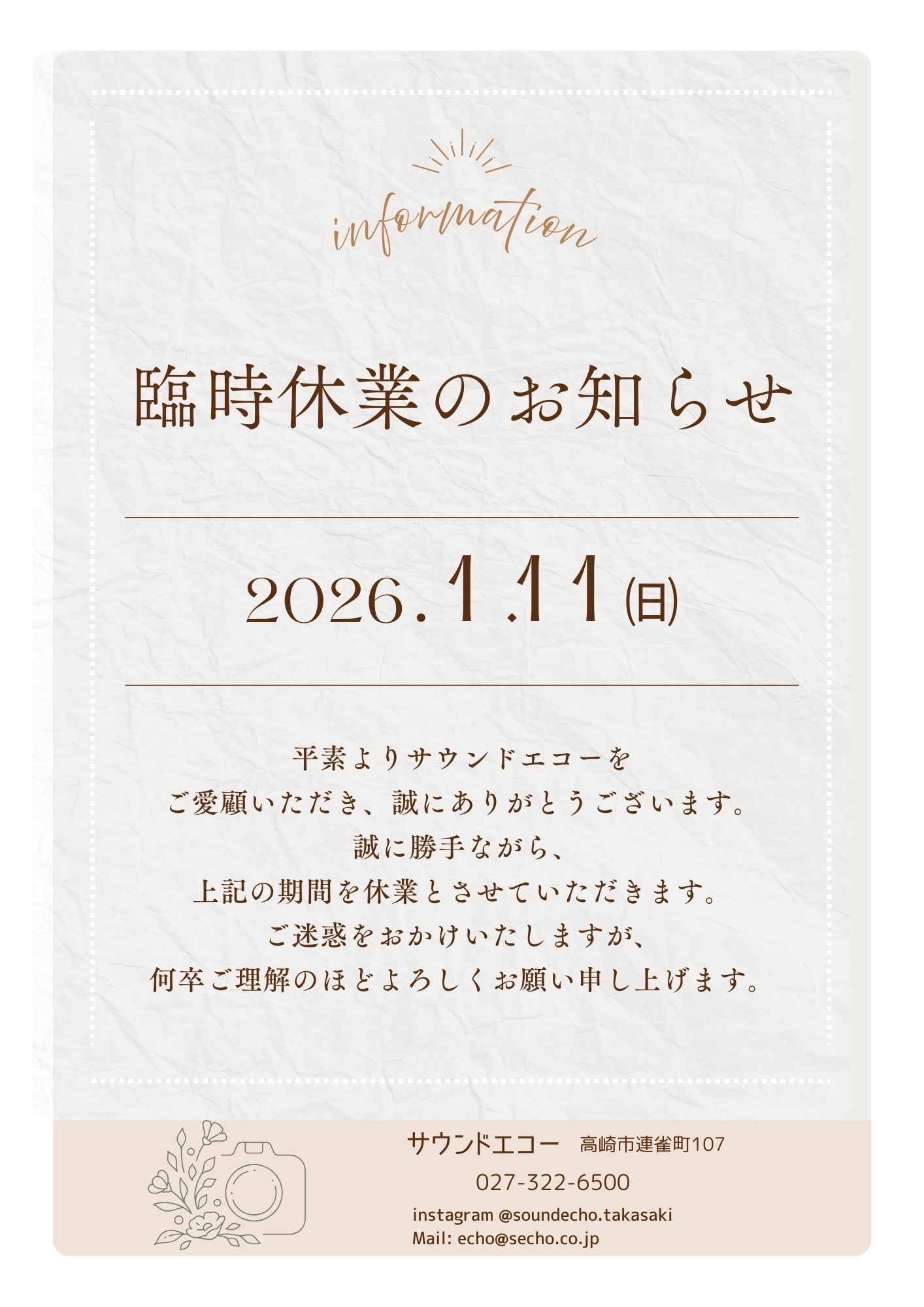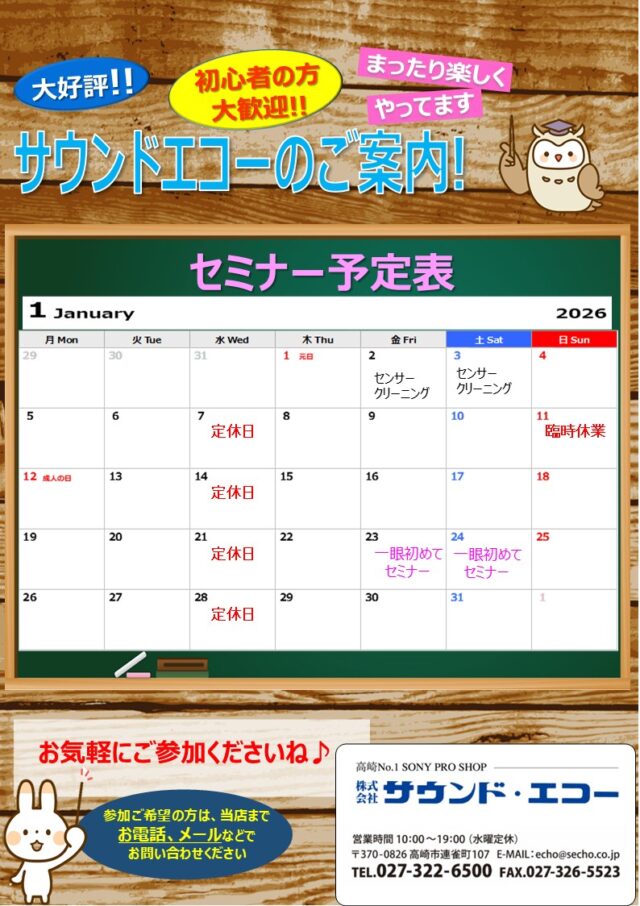 こんにちは!サウンドエコー須藤です(^^)/ 【臨時休業のお知らせ】 いつも当店をご愛顧いただき、誠にありがとうございます。 高崎市「二十歳の集い」の撮影、PAのため、以下の日程で臨時休業とさせていただきます。