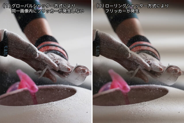 従来のローリングシャッター方式を搭載したカメラで撮影した場合、画面の上下で露光するタイミングが異なるため、どうしても撮影画像の上と下で明るさと色合いが変化してしまいますが、「α9Ⅲ」では、全画素同時に露光して読みだしを行うので、同一画像内のフリッカーは生じないというものです。フレーム間で発生するちらつきに関しても軽減できているようです。また、蛍光灯などの人工光源点滅のちらつきを検知して、フリッカーの影響が少ないタイミングで静止画を撮影できる「フリッカーレス撮影」にも対応です。