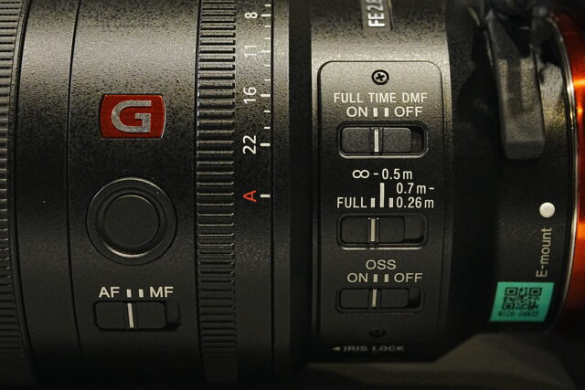 (レンズ右側)「絞りリングクリック切り替えスイッチ」 ONにすると「カチカチ」と一目盛り動かす毎に音がします。静止画撮影時と動画撮影時で使い分けられます。