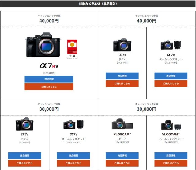 「α7RⅤ」「α7Ⅳ」が4万円、「α7Ⅲ」「ZV-E1」は3万円のキャッシュバックになります!