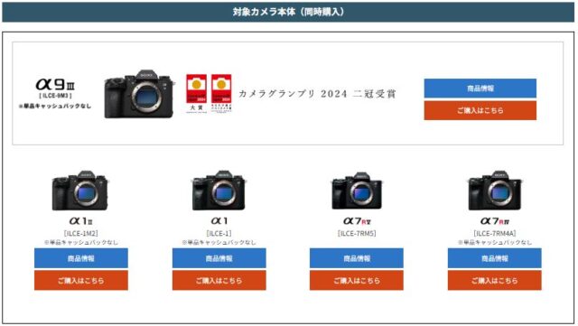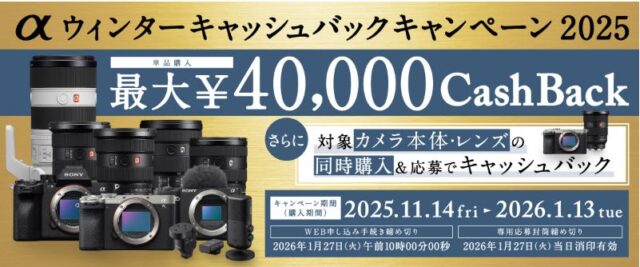 ソニーのカメラ「αウィンターキャッシュバックキャンペーン2025」が始まりました。