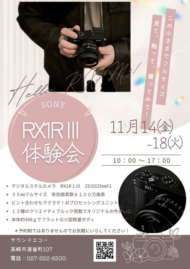 フルサイズデジタルカメラ「RX1RⅢ」体験会 ~見て触って撮ってみて!~ 2025年11月14日㈮~11月18日㈫まで