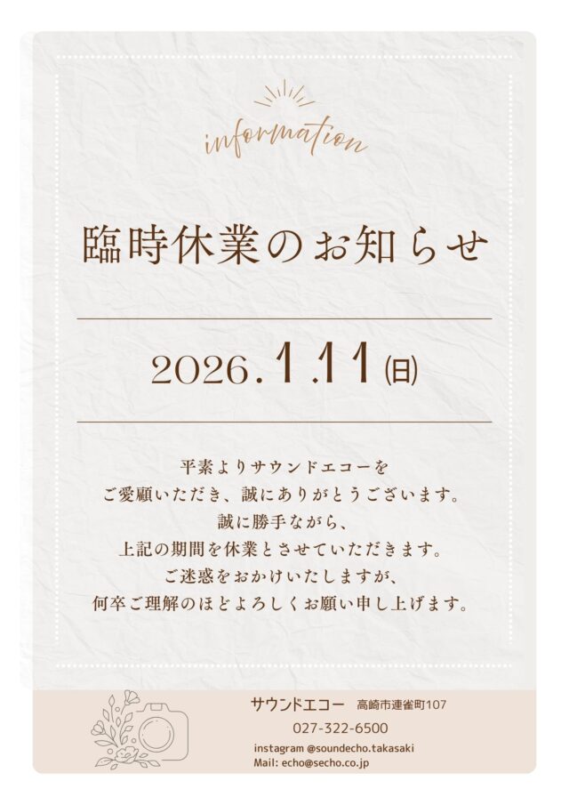高崎市「二十歳の集い」の撮影、PAのため、以下の日程で臨時休業とさせていただきます。