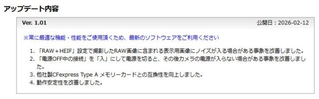 - 「RAW+HEIF」設定で撮影したRAW画像に含まれる表示用画像にノイズが入る場合がある事象を改善しました。