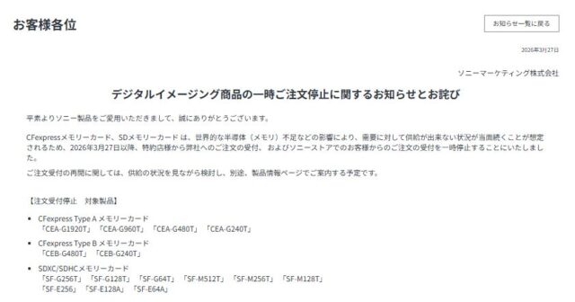 SONY SDカード、CFexpressカードが世界的な半導体(メモリ)不足などの影響により受注停止になっています