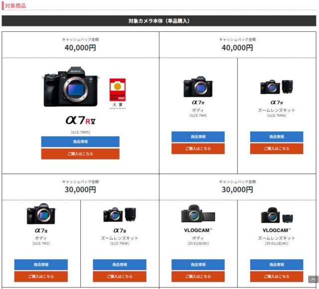 「α7RⅤ」「α7Ⅳ」が4万円、「α7Ⅲ」「ZV-E1」は3万円のキャッシュバックになります!